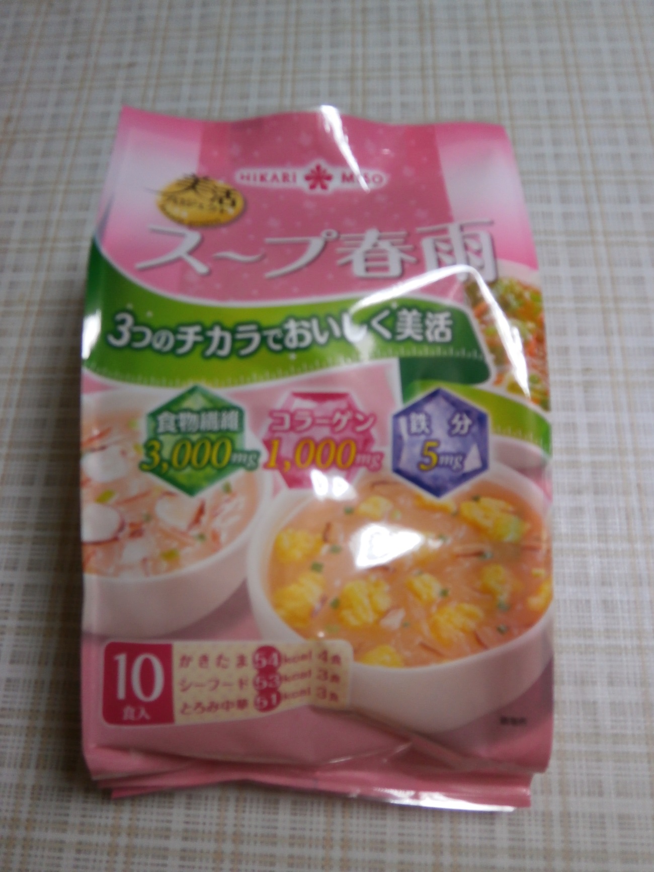 これはモニプラさんから届いたコラーゲン入りスープ春雨・・ 今までこんな感じのを食べた事がなくどんな感じになるかが とても楽しみです。 これには三種類の味があってコラーゲン・食物繊維・鉄分入りの 春雨スープ。 たきたま・シーフード・とろみ中華の3種類の味わいが楽しめます。 魚介やにくのうま味g効いたスープに、野菜などの具材を組み合わせ る事でおいしく頂けます。 10日分ありますからこれから毎日飲んで効果の程を期待したいです。