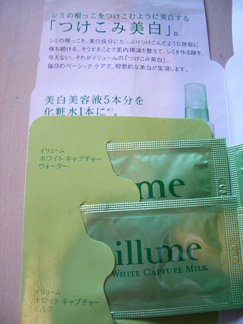 イリュームのホワイトキャプチャー サンプルをもらいました、右・左に2セット入っていて 「つけこみ美白」という言葉にひかれ 右側に入っていたものは即効使ってみました。 つけごこちは悪くなくてよかったですが 特に肌の感じに変化はナシだったので お値段的に今のアルビオンの方を続けようかと。 続けたら美白効果はあるかもですね☆