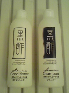 これ黒酢とモズクエキスの入ったヘアシャンプー&コンディショナー!原料は全て安全なものでノンパラベン。洗ったあと髪が軽くなる、というので試してみました。 ニオイは流石に酢だけあってよいとはいいがたいけれど初めて洗った時にホントに軽っ!もともと髪質がやわらかくて少ないから別に軽くなくてもいいやって思ってたけどコレはアタマがスッキリ軽くなるカンジ。