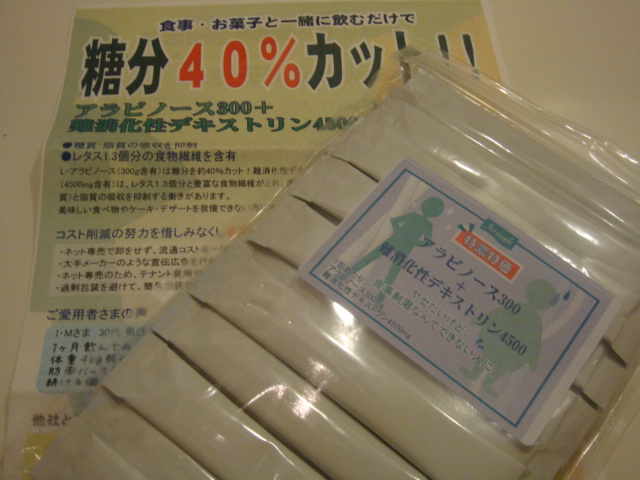 ドリンクに溶かして食事と一緒に摂取し、 糖分の吸収を抑えるダイエットサポート食品。 食べながらダイエットしたい、 ケーキ・デザートを我慢できない方にオススメです。 ・L-アラビノース300mg(1包中) 特定保健用食品として厚生省から認定されている素材、 L-アラビノースは、トウモロコシや甜菜から精製された成分。 食物に含まれる糖分を分解して体に吸収する酵素の 働きを阻害するため、砂糖の吸収を40%カットしてくれます。 ・難消化性デキストリン4500mg(1包中) レタス1.3個分の食物繊維。 デンプンから抽...