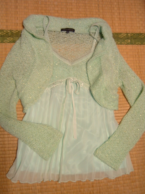 バーゲンの戦利品第2弾 その6 こちらも、あまりの可愛さに一目惚れ〜!値切って…1800円くらいでゲットしました!キャミソールは上部がニットで、胸のところでシフォンのプリーツに切替えられています。胸の白のサテンリボンがまた可愛いのです!その上から同じニット素材のボレロを重ねるのですが、形が物凄く良い!チラチラ光るゴールドラメが本当に綺麗で、パーティー用に絶対使います!キャミソールがちょっと長めなので、下にはパンツの方が合うかな。もう最高。
