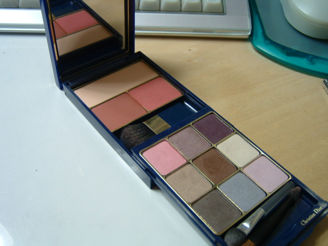 バーゲンの戦利品第2弾 その2 ディオールのアイシャドウ&チーク&プレストパウダーの豪華二段式パレットです。何と1200円くらいで買いました!! 一段目にアイシャドウ9色、二段目にチーク2色とプレストパウダー、ブラシが収納できて、旅行やお出掛けの時にはコレ1つ持って行けば事足ります!かなり使える色ばかりで、お気に入りのパレットです☆ ただ、香りが私の苦手な「シナモン」なんだよな〜…そこだけ除けばパーフェクト!良い買い物しちゃいました♪