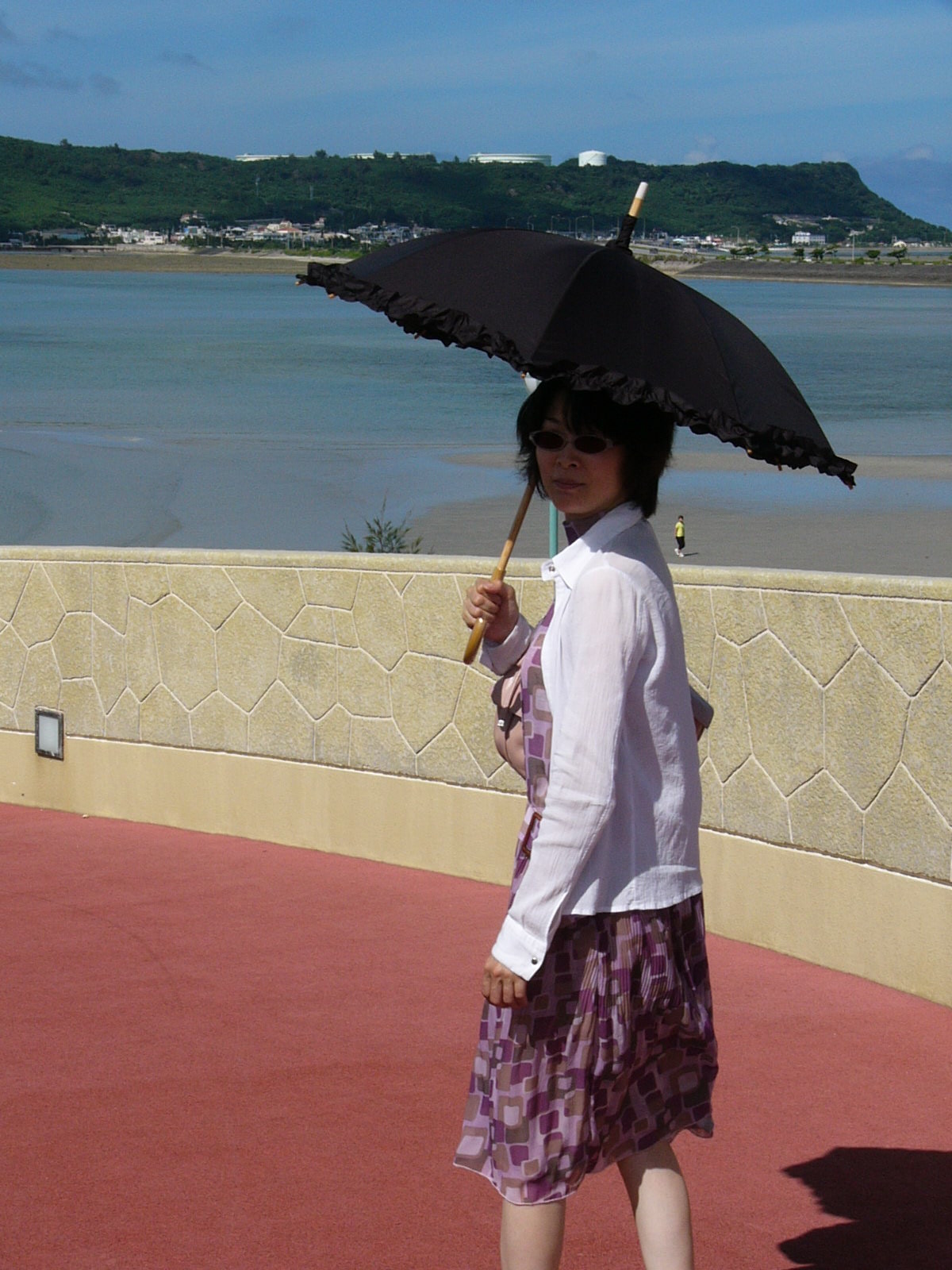 沖縄の紫外線に焦げそうな暑さの中外を歩くのは一分でも辛いので、日傘プラス、薄手のジャケットをはおりました これのおかげでうでの日焼けが最小限になりました