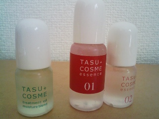 ☆TASU+美容液・ヒアルロン酸ブレンド essence01は水のような感触で一気に肌に吸い込まれていきます。 essence02は01よりもしっとりぷるんとしています。 驚いたのは、肌に浸透した直後に肌がさらっさらになったことです。 ☆TASU+トリートメントオイル オイルですが、余計なベタつきを感じさせず、とても使いやすいです。マッサージすることによって、より浸透を促進し、保湿の効果が上がるように感じました。 少量の使用で満足できるので、長く使えそうです。
