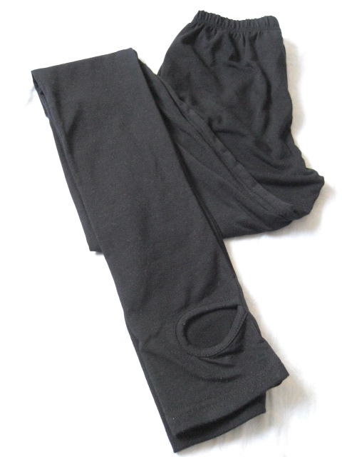 ヤフーショッピングで購入した、かかとに穴の開いた黒のレギンスです。 送料無料で699円という価格でしたが、生地の厚さがちょうどよくほどよいフィット感があり、履き心地も良いです。 また丈も少し長めにつくられてあるので、履くと足首の所が少しくしゅくしゅっとなって可愛いです。 秋のファッションに大活躍しそうな一枚です!