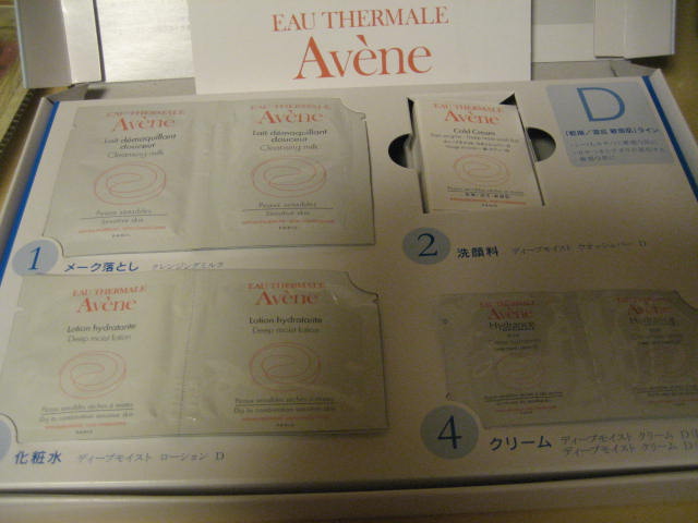 メイク落とし、化粧水、クリームのサンプルです。 アベンヌウォータのイメージでさっぱりした感じかと思って使ってみましたが、思いのほかしっとりとした使用感でした。 冬の乾燥のレスキューアイテムとして使えます!! べとつかないでしっとりするので、使いやすいですね。以外とよさそうです。