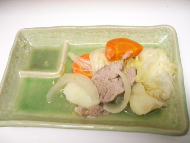 ヒレ肉を煮た汁をベースに キャベツとニンジン、ジャガイモ、タマネギが 入っています。 キャベツを特にたっぷりいれているのでヘルシーで 全体的にさっぱりしているし腹もちもいいです。 朝ごはん代わりにもなってGOODっす! スープとしてもイケるしこんな盛り方すれば おかずにもなるし★