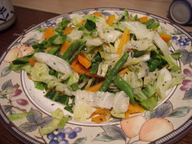 これも簡単ヘルシーでボリューミィ。 おかずでもこんだけお野菜あると お腹いっぱいになるのでご飯やお肉の量も 控えることができます☆ ニンジン、キャベツ、インゲンをざっくり イタめて黒ゴマと塩コショウだけ。 …すいません、盛り方汚いですね(性格でました)