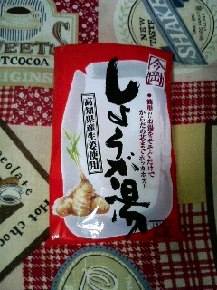 ◎健康法◎ 今岡のしょうが湯です。 風邪を引いてのどが痛い時に買いました。 のどの痛みがひどい時に、これをお湯にサッと溶かして 飲むとスッキリします。 しょうが湯って昔は好きじゃなかったけど、 しょうがの甘さとほろ苦さが今は好き。 なんかおばあちゃんになった気分(笑) 夜寝る前に飲みたくなりますね。