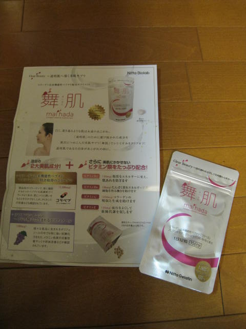 秋のビューティーパーティーIN大阪に参加してもらった、 Nitta Gelatin「舞肌」15日分を試した感想です。 これはコラーゲン加工食品のサプリメントで、栄養補助食品として、1日12粒を目安に水またはぬるま湯で飲むといいようで、私もその通りに飲みました。 初めて袋を開けた時、とてもいいにおいが!説明を見るとブルーベリーの香りがついているとのことです。 コラーゲン、プロアントシアニジン、ビタミンC、B2、B6、Eなど、美容に大切な成分が配合されているからか、 いつも生理前には、みにくいニキビがあちこちできていた...