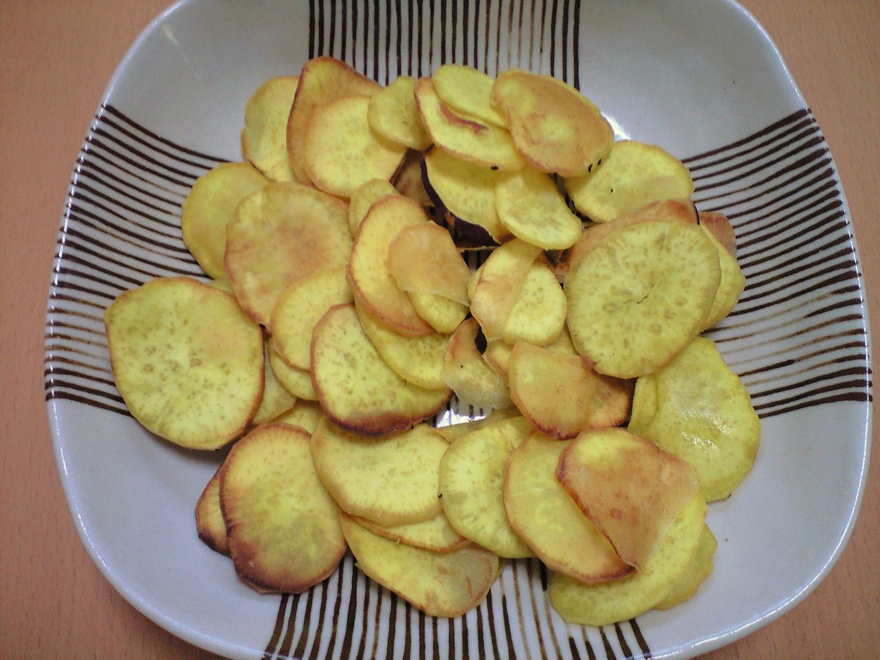 さつまいもチップスは、とても簡単で美味しいですよ〜。 作り方は、 ,気弔泙い發鯒く輪切りにして、しばらく水にさらす。 ▲ッチンペーパーで、水気をふく。 からっと油であげる 以上でおしまいです。 これで、きれいな黄色のサツマイモチップスの完成で〜す。