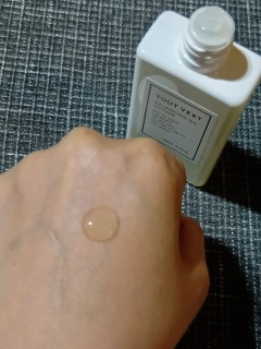 ガラスのプッシュタイプのボトル。 中身のキラキラした色が見えるのが素敵。 中身は、とろっとややゆるめなテクスチャー。 すっとスムーズになじみ、べたつかない。 しっとりとするような使い心地でハリツヤ(個人の体験による) シトラス系やハーブによるさわやかな香りがふわっとただよって素敵。 べたつかないので朝晩使いやすいので気に入ってます。