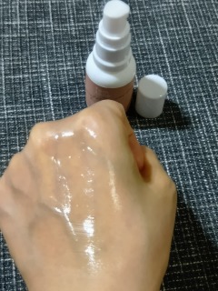 ガラスのプッシュタイプのボトル。 中身のキラキラした色が見えるのが素敵。 中身は、とろっとややゆるめなテクスチャー。 すっとスムーズになじみ、べたつかない。 しっとりとするような使い心地でハリツヤ(個人の体験による) シトラス系やハーブによるさわやかな香りがふわっとただよって素敵。 べたつかないので朝晩使いやすいので気に入ってます。