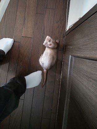 いたちのお嬢様、人間を引き連れて廊下をお散歩。