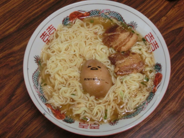 買っておいたラーメンの具のレトルト(チャーシューと煮玉子)を使って、袋麺を茹でました。最近使っていなかった、食べられるデコシールを使ってみました。ぐでたまの、おさまりがいい!?