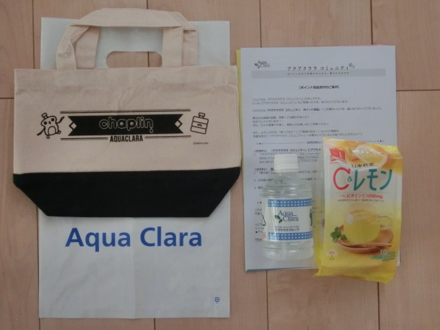アクアクララのコミュニティで、ポイントを使ってプレゼント応募したら、当選しました。ミニトート、ミネラルウォーター、ビタミンCの粉末清涼飲料が入っていました。アクアクララを使っていないですが(^_^;)