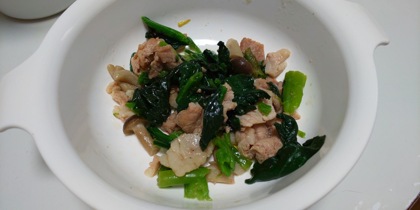 ほうれん草とシメジと豚肉のソテー。鶏ガラ味(?)