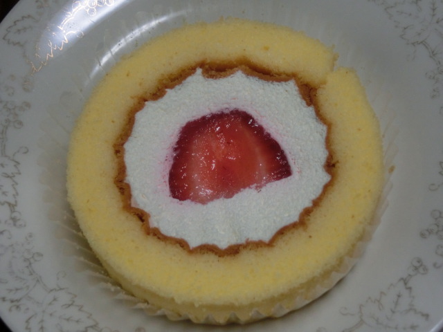 こんな時間に載せていますが、食べたのは朝です。いちごのせロールケーキです。期限切れ間近で割引、アプリの割引使って50円で買えてしまいました。お出かけ前に食べてよかったです。