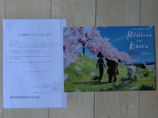 一昨日届きました。リラックマとカオルさんのクリアファイルが当選しました。クリアファイルなのに、ご丁寧に宅急便で送られてきました。