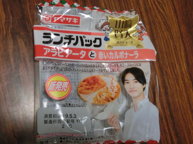 気づいたときには、食べてしまった後(^_^;)ランチパックの中身がアラビアータとカルボナーラ。炭水化物オン炭水化物!実は売れ残りで半額・・・、ウインナーソーセージと一緒に食べたら、相性抜群でおいしかったです。