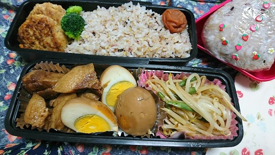 豚の角煮と豆腐ハンバーグともやしといんげんのソテーです。頑張りました。