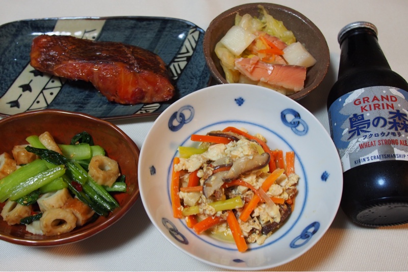 今晩の献立は ソイの昆布醤油漬け、炒り豆腐、ちくわと小松菜の炒め物、石狩漬けです。お風呂上がりに 昨日発売のグランドキリン 無濾過ビール 梟(フクロウ)の森を飲みます。