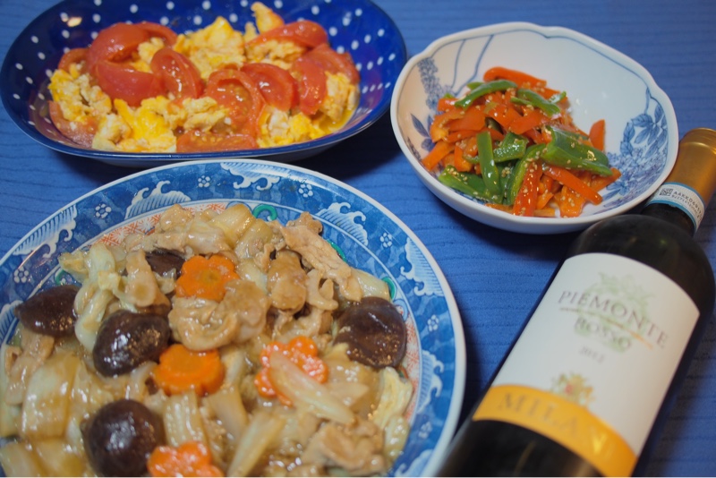 今晩の献立は 白菜と豚肉のオイスターソース炒め、トマトと卵炒め、ピーマンのナムルです。お酒はイタリアの赤ワイン ミディアムボディをいただきます。北海道のコンビニ セイコーマートで550円でした。晩酌のお酒の価格は高くても安くても 楽しく飲んで幸せな時間です。