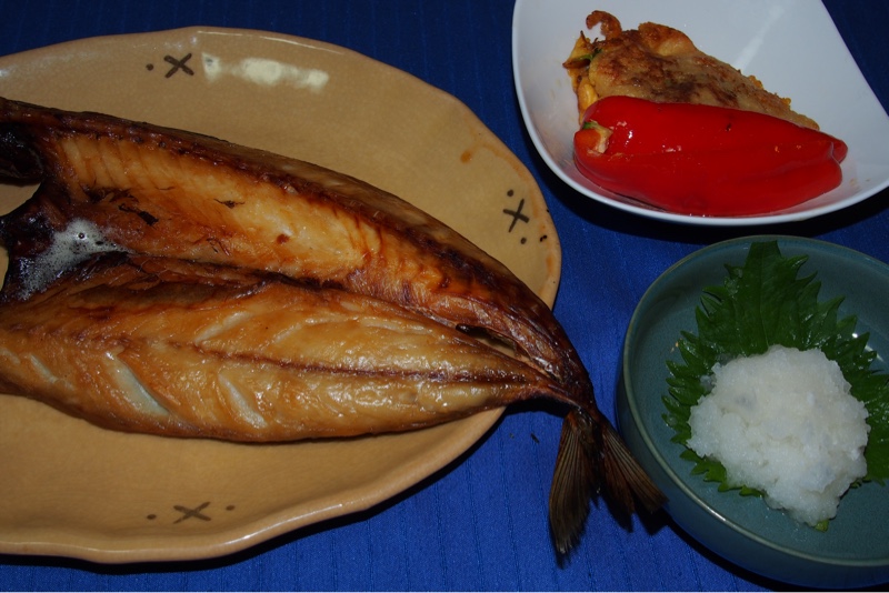 今晩の献立は さばの開き、油揚げの信田焼き(三つ葉、なめたけ、卵入り) 赤ピーマン、大根おろしです。お酒は バーボンのソーダ割りをいただきます。