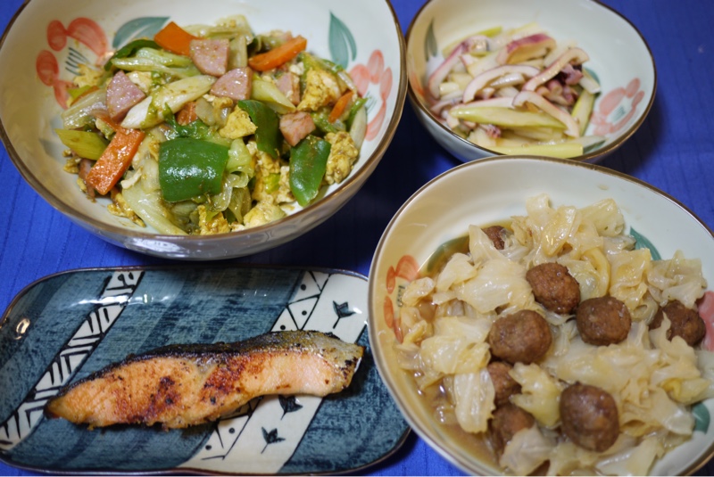 今晩のおつまみは トラウトサーモンの西京焼き、レタスと卵とハムのカレー炒め、キャベツのミートボール煮込み、イカとセロリの和え物です。家の食料が少なくなってきました。最後にスーパーに行ったのは 先週の金曜日です。明日は買い物 に行けるかなぁ・・・雪が降ったので足元が気になります。