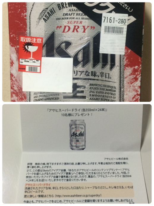 sketsのアサヒビールのアイディア会議の賞品が届きましたー(*^_^*)アサヒスーパードライ24缶です。毎日お酒飲むのでとっても嬉しい〜☆