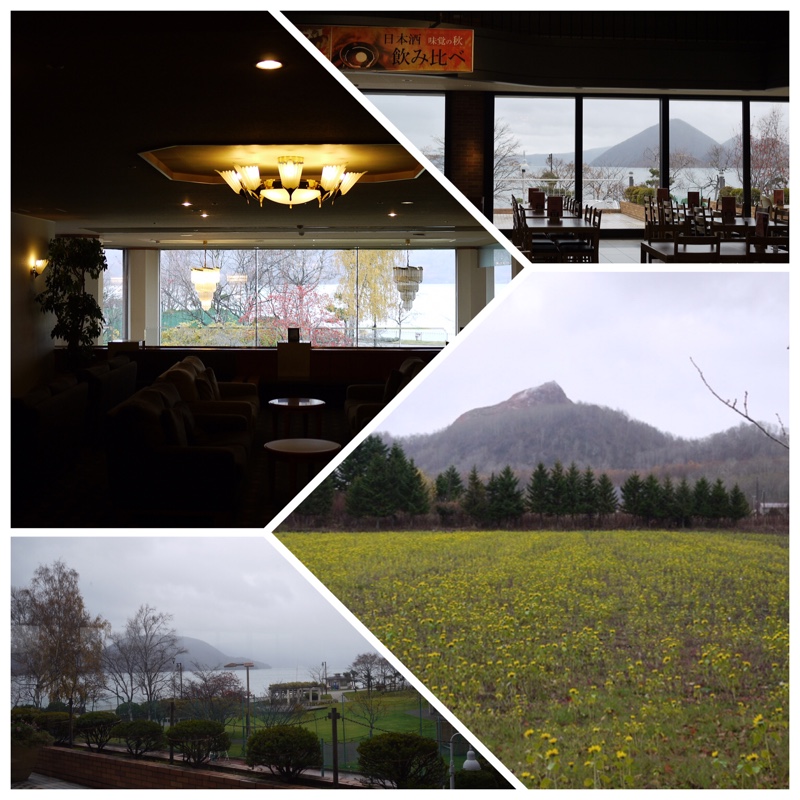 洞爺湖温泉に来ています。お天気は 曇り時々雨です。手前の黄色い花はひまわり。 奥に見える山は昭和新山です。