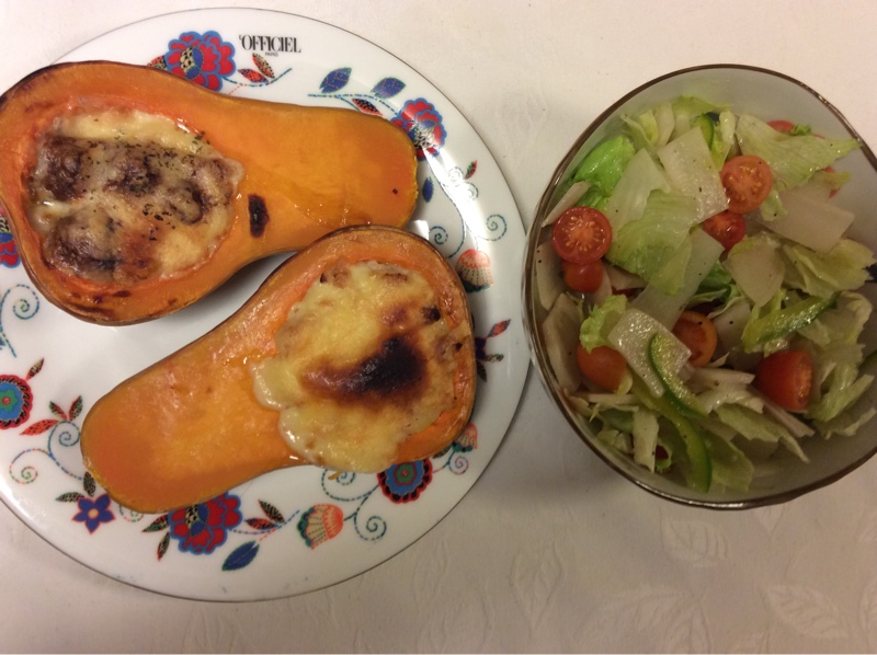 バターナッツかぼちゃのチーズ焼き 二種(ミートボール、ポテトサラダ)とヤーコンのマリネサラダ(ミニトマト、レタス、パプリカ)をつくりました。どちらの食材も初めて調理しました。ヤーコンはラクトオリゴ糖が豊富な南米アンデス産のキク料の根菜です。食感は梨に似ています。