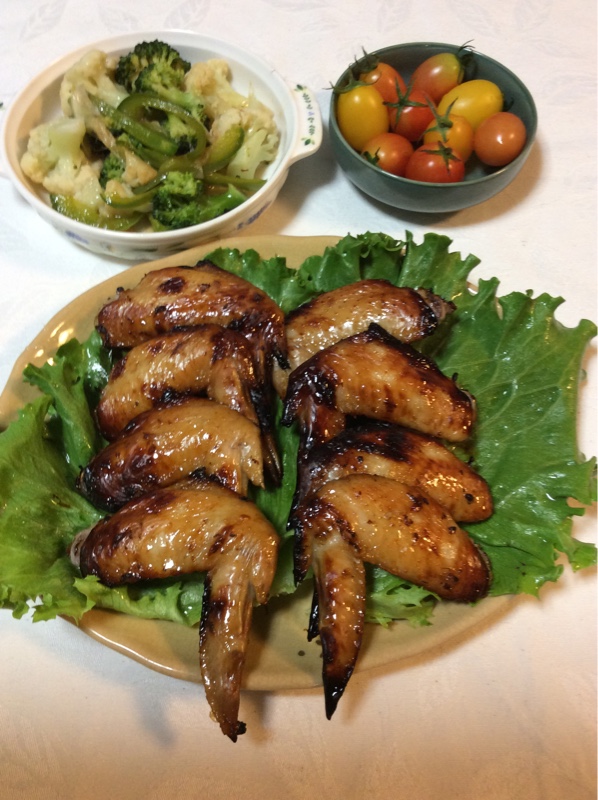 今晩のおつまみは 手羽先の香り焼き、ブロッコリーとカリフラワーのオイスターソース炒め、ミニトマトです。手羽先は身に爪楊枝を数カ所刺して お昼頃からタレ(焼肉のタレ、醤油、味醂、酒、すりおろした大蒜と生姜とリンゴ)が入ったビニール袋に漬け込みオーブンで焼きました。