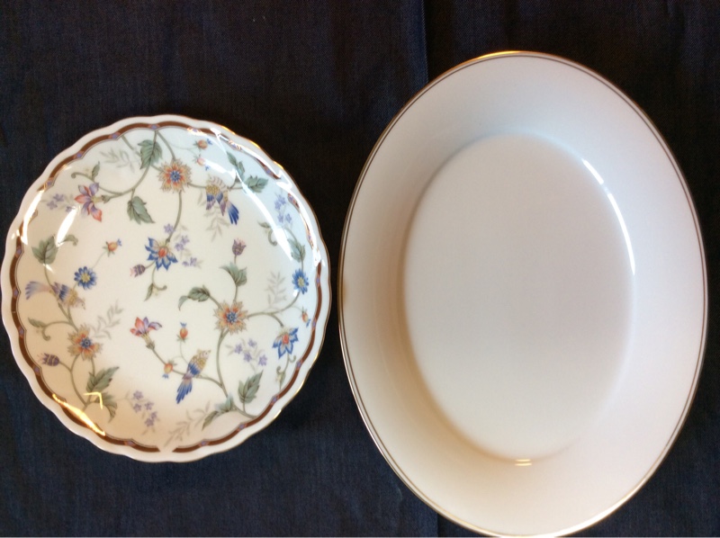 洋食器を買いました。絵皿がNARUMI 白いプレートがNoritakeです。食器が好きで食器のサイトを見たりウィンドウショッピングの時間が楽しいひと時です。先日 以前から欲しかった大皿の洋食器がお手頃価格で売られているのを見つけて さっそく購入しました。嬉しいです。