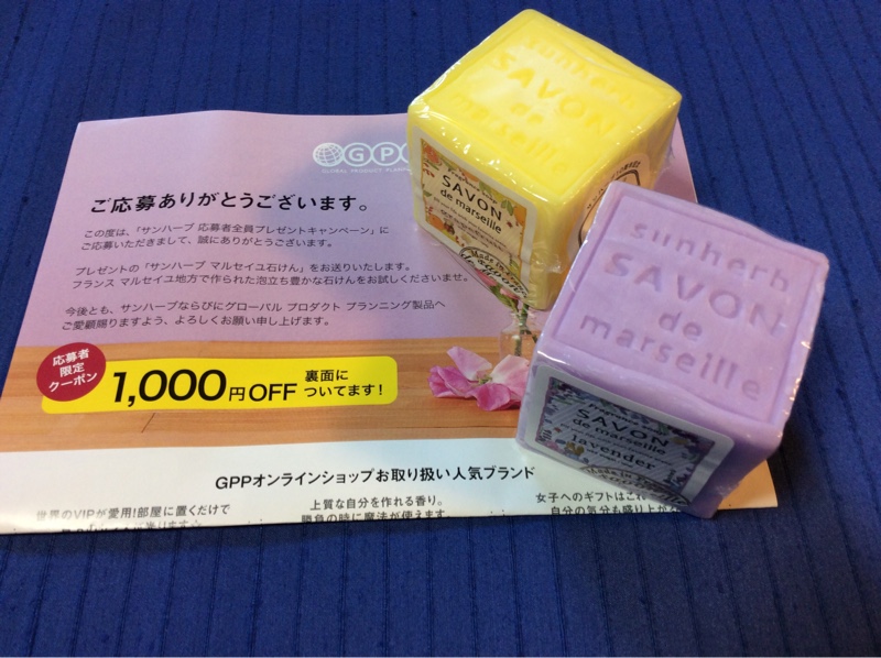 水曜日のヤマトさんのお届けものは フランス マルセイユ地方でつくられた石鹸でした。グレープフルーツとラベンダーの香りの石鹸はどちらも とってもいい香りです。タンスの引き出しに入れようかなと思っています。こちらは応募者全員プレゼントでした。