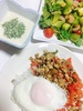 今日の夕ご飯です(o^^o)RSPでもらった大豆のガパオライスの素を使って、ガパオライスとアボカドと海老のサラダ、豆乳スープ☆ヘルシーで美味しいです!