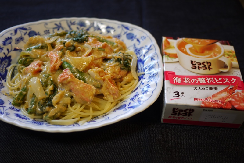 お昼ごはんは ビスク風クリームパスタです。クリームソースはこちらのスープと少量の牛乳でつくりました。具材は紅鮭、玉ねぎ、さやえんどう、ほうれん草です。いただきます。