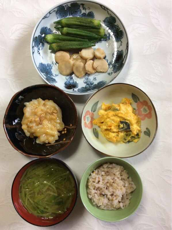 お昼ごはんは 帆立とオクラのソテー、いかとウニの和え物、栗かぼちゃのサラダ、雑穀玄米ごはん100g、ほうれん草の味噌汁です。いただきます。