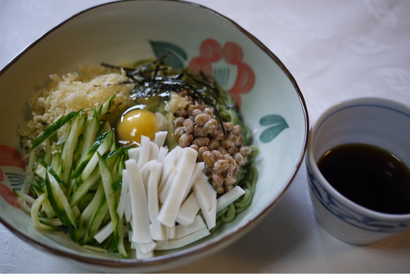 お昼ごはんは たぬき納豆そばをつくりました。麺は更科そば粉に昆布とわかめを練りこんだ みどり色のお蕎麦 知床そばです。いただきます。