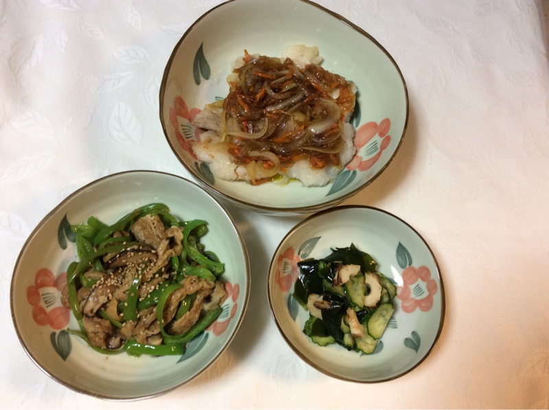 おつまみを つくりました。鱈の甘酢あん、ピーマンと椎茸と油揚げのきんぴら、胡瓜とわかめとちくわの酢の物です。鱈の甘酢あんのレシピでは 鱈を揚げて使うのですが、カロリーダウンのため片栗粉を付けて焼きました。昨夜は疲れて あまりお酒を飲めなかったけれど、今日は元気になりました。