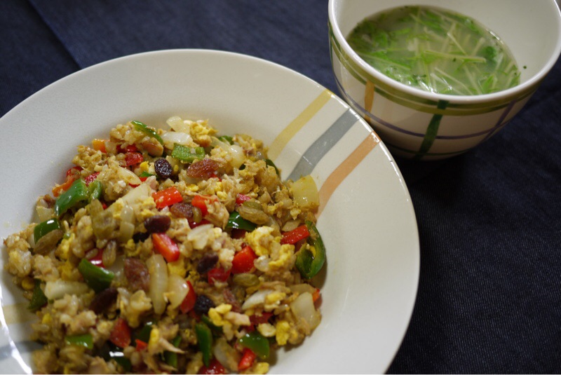 お昼ごはんは ツナ缶を使ってカレーチャーハンをつくりました。スープはごぼうと水菜のスープです。いただきます。