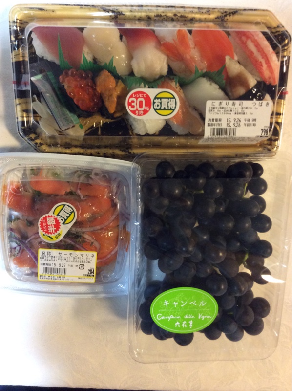 ドライブから帰りました。富良野カンパーナ六花亭で ぶどうを、スーパーでお寿司とマリネを買ってきました。これから お風呂に入って晩酌します。