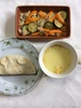 お昼ごはんは ズッキーニとパプリカとあさりのアヒージョ、つつみピザ、コーンスープです。いただきます。