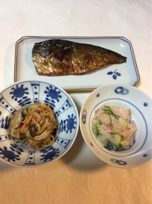 おつまみをつくりました。鯖のみりん干し、切り干し大根と油揚げの煮物、玉ねぎと胡瓜とハムのマリネです。鯖をフィッシュロースター(電気魚焼き器)のつけ魚コースで焼きました。きれいに焼けて 食感もふっくらです。残念なのは片付けが面倒な事です。魚焼きはフライパンの方が活躍しています。
