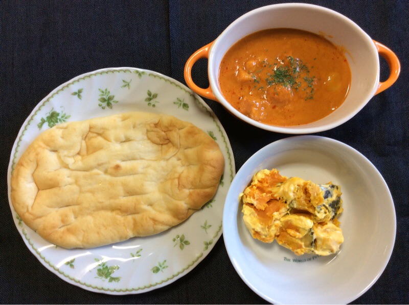 お昼ごはんは チキンカレー、ナーン、栗かぼちゃのサラダです。いただきます。