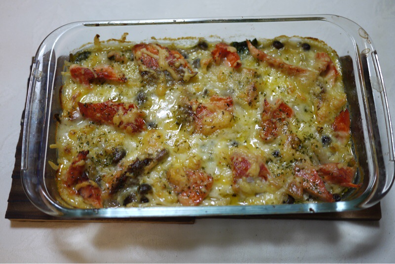 グラタンをつくりました。具材は紅鮭甘口、しめじ、えのき、ほうれん草です。今晩も冷蔵庫整理です。ホワイトソースは ジャガイモのポタージュカップスープと牛乳でつくりました。今日は主人が早く帰ってきたので熱いうちに一緒にいただきます。
