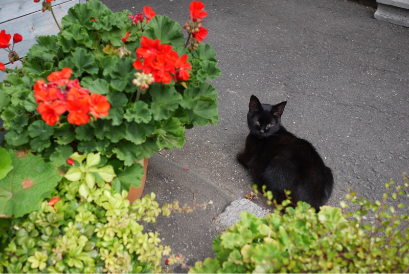 散歩中 黒猫さんに会いました。以前この黒猫さんは 野良ちゃんだと聞きました。カメラを向けてもじっとしている黒猫さんです。