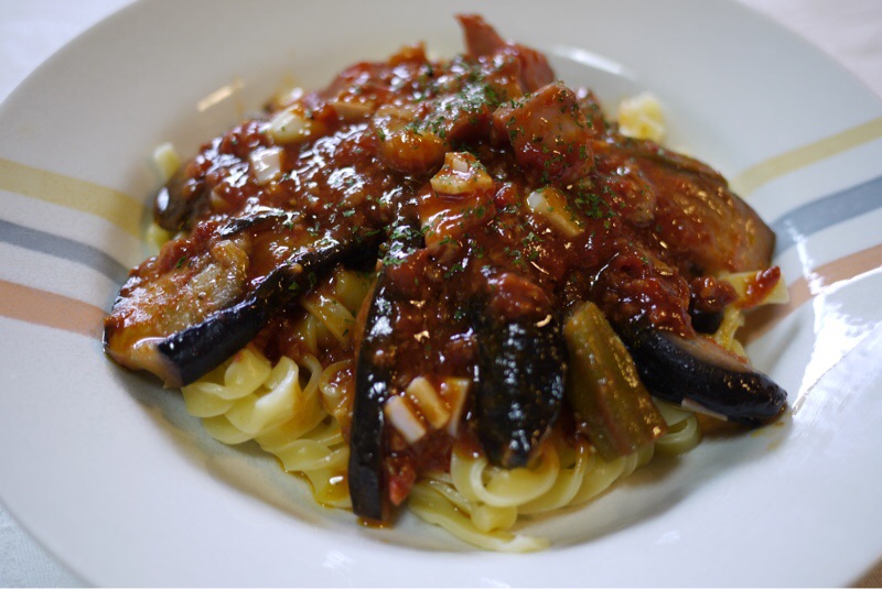 お昼ごはんは 茄子とひき肉のトマトソースの生パスタ フィットチーネをつくりました。いただきます。