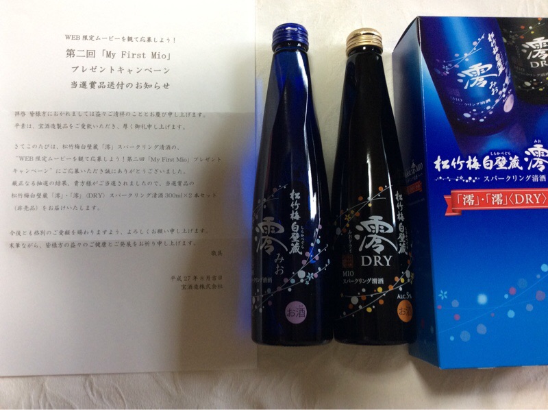 日本酒が当選しました。スパークリング清酒二本は非売品です。いったいどんな味なのか?早くも晩酌が待ち遠しい呑み助です。