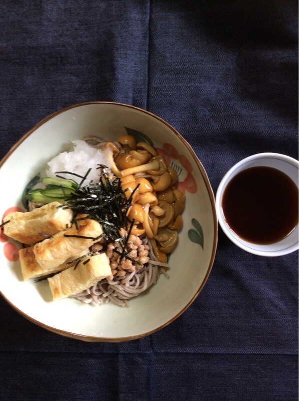 お昼ごはんは なめこおろし蕎麦をつくりました。油揚げと納豆をプラスしました。いただきます。